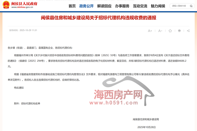 海西房产网(微信公众号:fjhxfcw)消息:近日, 闽侯县住房和城乡建设局发布“关于招标代理机构违规收费的通报”。