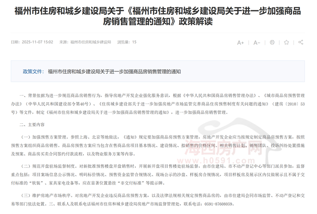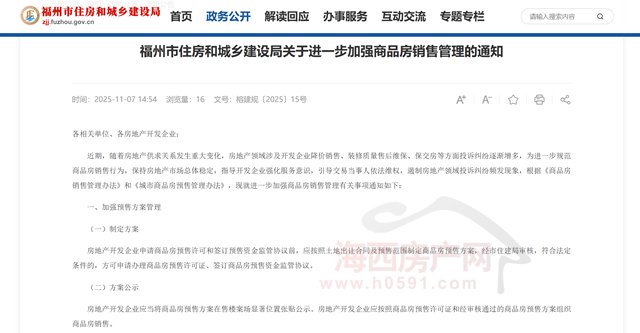 11月7日,福州市住房和城乡建设局下发“关于进一步加强商品房销售管理的通知”。
