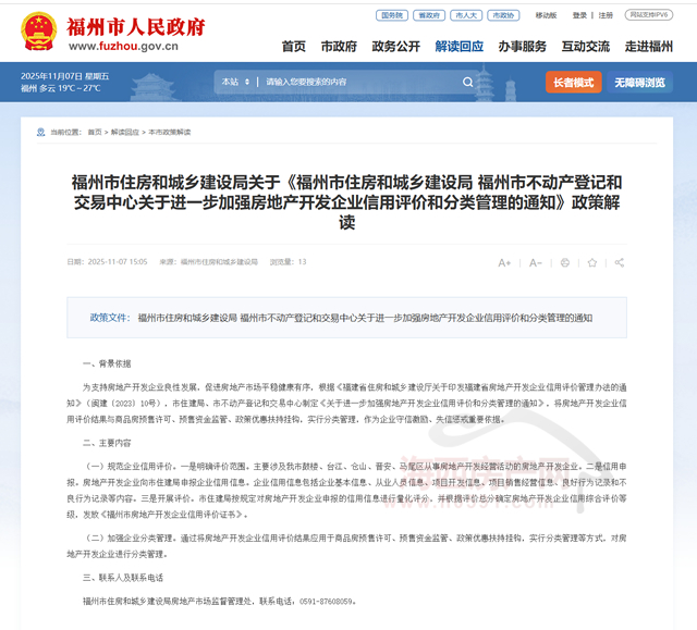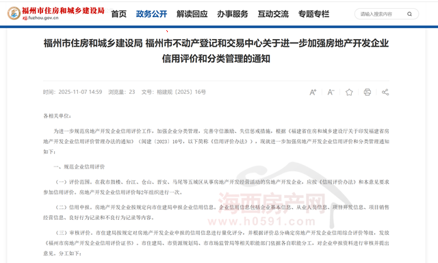 同日,福州市住房和城乡建设局、福州市不动产登记和交易中心联合发布“关于进一步加强房地产开发企业信用评价和分类管理的通知”。