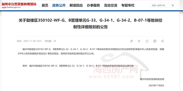 海西房产网(微信公众号:fjhxfcw)消息: 2025年11月6日,福州市自然资源和规划局发布“关于鼓楼区350102-WF-G、B管理单元G-33、G-34-1、G-34-2、B-07-1等地块控制性详细规划的公告”。