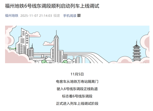 据悉,为确保本次列车安全顺利上线调试,福州地铁组织各参建单位积极谋划前置工作,顺利完成全线车站主体以及轨道工程验收、限界检测、接触网送电、系统调试以及冷、热滑等一系列准备工作。