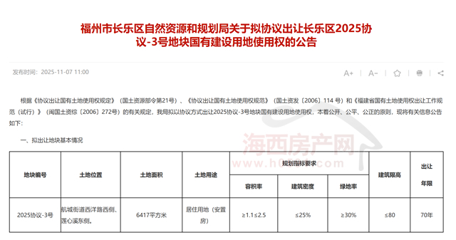 海西房产网(微信公众号:fjhxfcw)消息:11月7日,福州市长乐区自然资源和规划局发布“关于拟协议出让长乐区2025协议-3号地块国有建设用地使用权的公告”。
