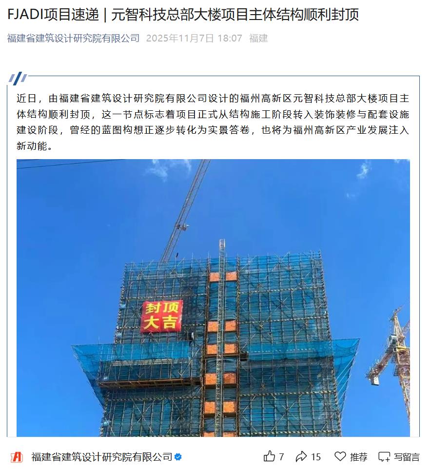 据“福建省建筑设计研究院有限公司”11月7日报道,近日,由该公司设计的福州高新区元智科技总部大楼项目主体结构顺利封顶,这一节点标志着项目正式从结构施工阶段转入装饰装修与配套设施建设阶段。