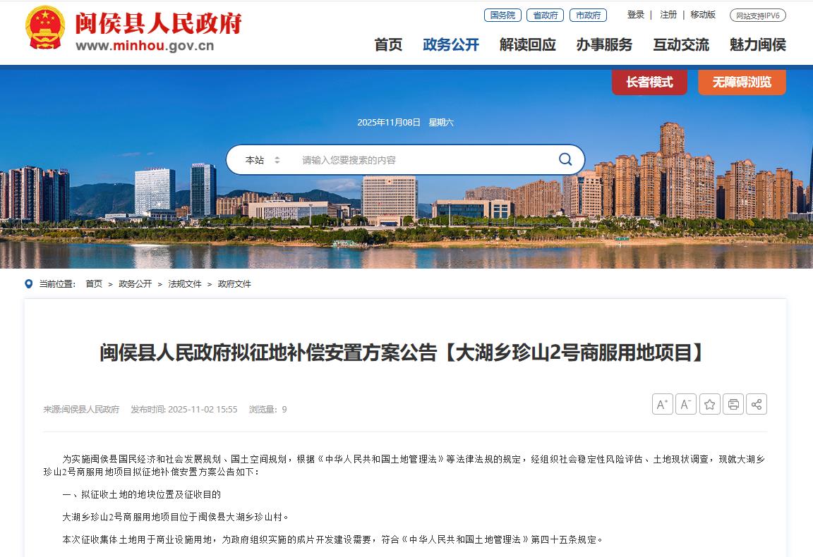 海西房产网(微信公众号:fjhxfcw)消息:2025年11月2日,闽侯县人民政府发布“拟征地补偿安置方案公告【大湖乡珍山2号商服用地项目】 ”。