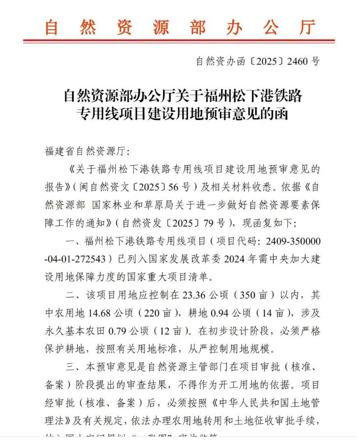 近日,左海集团权属左海建投公司负责建设的福州松下港铁路专用线项目,迎来关键性重大突破——项目用地预审正式获得中华人民共和国自然资源部批复!这一成果不仅标志着项目前期筹备工作成功跨越了核心梗阻,更为后续全面开工建设筑牢了坚实的法律根基与土地保障,为项目加速推进注入强劲动力。