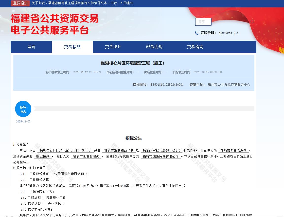 2025年11月7日,福州市公共资源交易服务中心发布“融湖核心片区环境配套工程(施工)”。