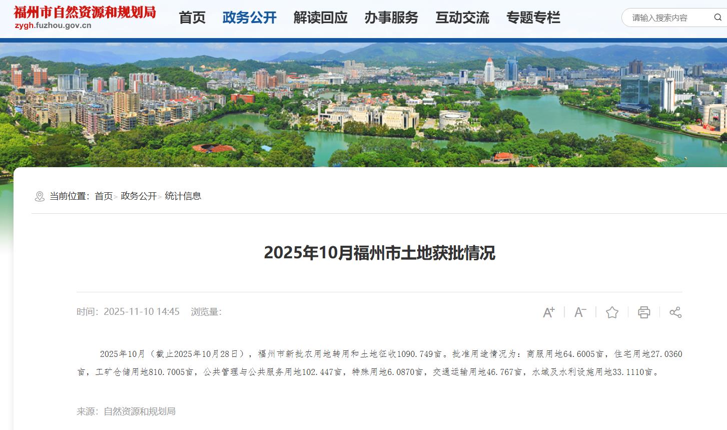 2025年10月(截止2025年10月28日),福州市新批农用地转用和土地征收1090.749亩。