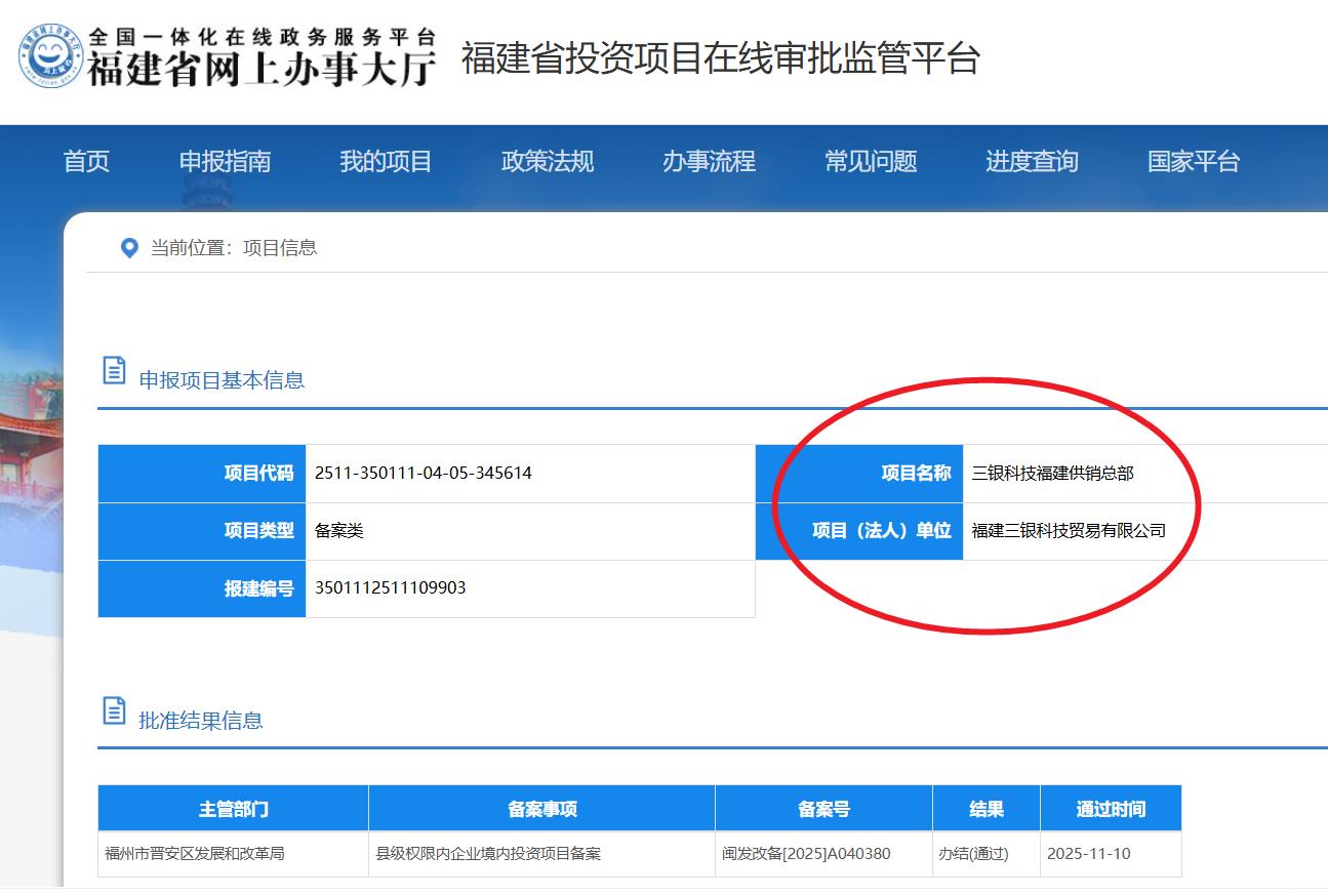 海西房产网(微信公众号:fjhxfcw)消息:福建省投资项目在线审批监管平台发布信息显示,“三银科技福建供销总部”已于11月10日取得县级权限内企业境内投资项目备案,批准结果信息为办结(通过)。