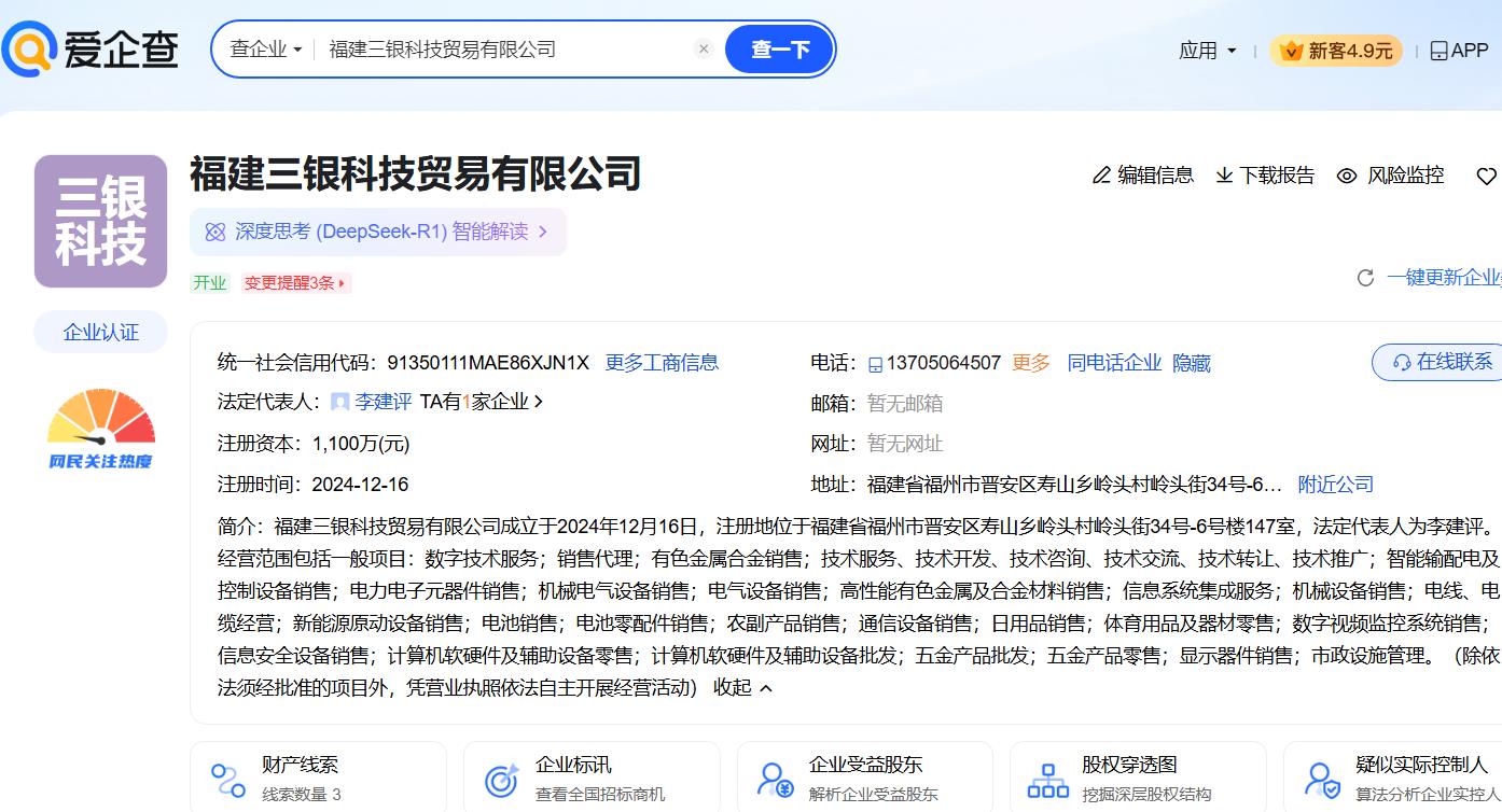 福建三银科技贸易有限公司成立于2024年12月16日,注册地位于福建省福州市晋安区寿山乡岭头村岭头街34号-6号楼147室,法定代表人为李建评。
