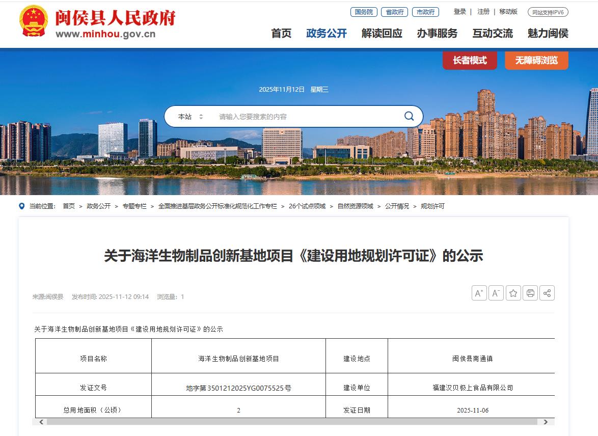 2025年11月12日,闽侯县人民政府发布“关于海洋生物制品创新基地项目《建设用地规划许可证》的公示 ”。