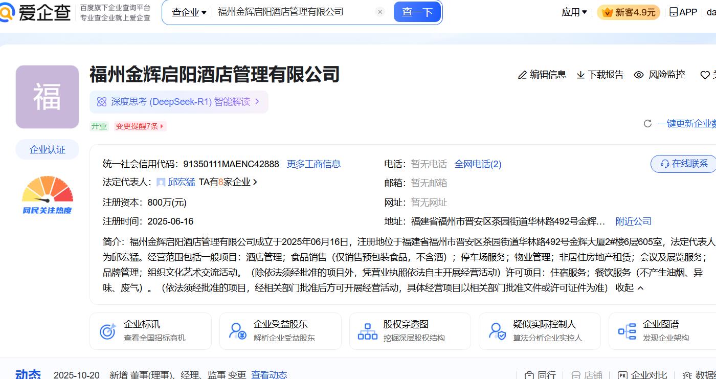 爱企查平台显示,项目法人福州金辉启阳酒店管理有限公司,成立于2025年06月16日,注册地位于福建省福州市晋安区茶园街道华林路492号金辉大厦2#楼6层605室。