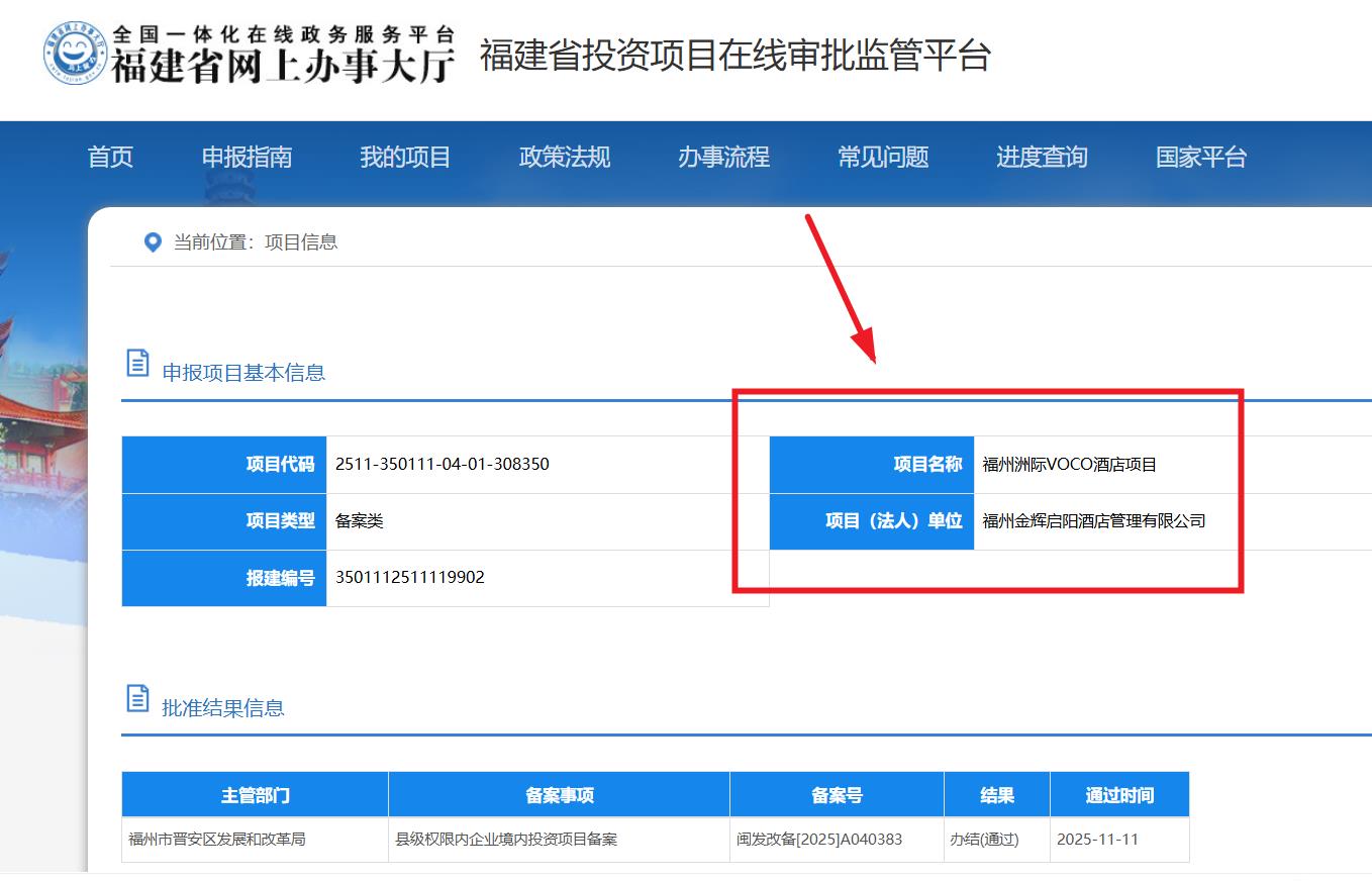 海西房产网(微信公众号:fjhxfcw)消息:福建省投资项目在线审批监管平台发布信息显示,“福州洲际VOCO酒店项目”已于11月11日取得县级权限内企业境内投资项目备案,批准结果信息为办结(通过)。
