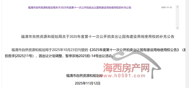 公告显示,福清市自然资源和规划局于2025年10月23日刊登的《2025年度第十一次公开拍卖出让国有建设用地使用权公告》(融土拍告字[2025]11号),因出让计划调整,暂停宗地2025拍-14号出让活动。