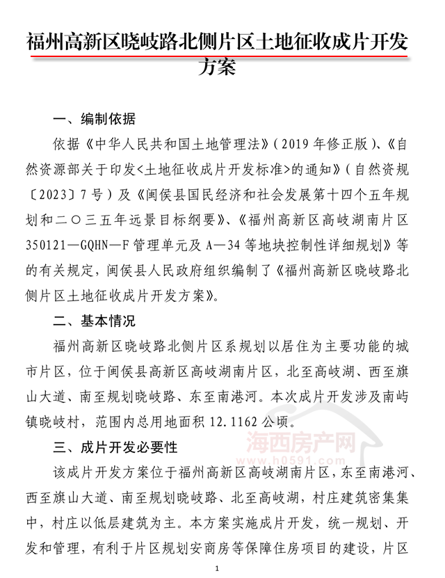 据了解,早在2024年12月6日,闽侯县人民政府发布“关于福州高新区晓岐路北侧片区土地征收成片开发方案的公示”。