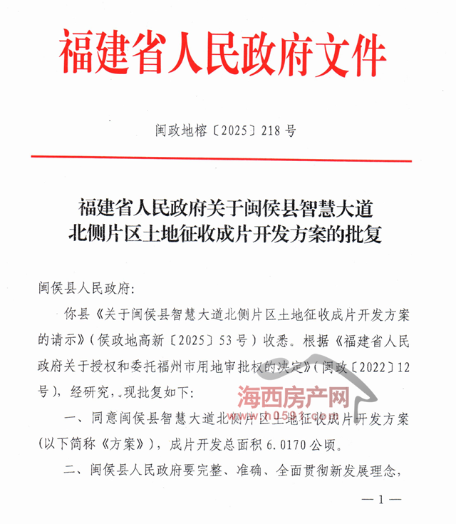 11月12日,福建省人民政府发布“关于闽侯县智慧大道北侧片区土地征收成片开发方案的批复(闽政地榕〔2025〕218号)”。