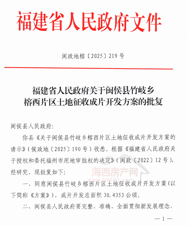 11月12日,福建省人民政府发布“闽侯县竹岐乡榕西片区土地征收成片开发方案的批复(闽政地榕〔2025〕219号)”。
