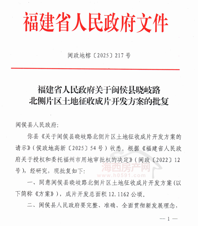 11月12日,福建省人民政府发布“关于闽侯县晓岐路北侧片区土地征收成片开发方案的批复(闽政地榕〔2025〕217号)”。