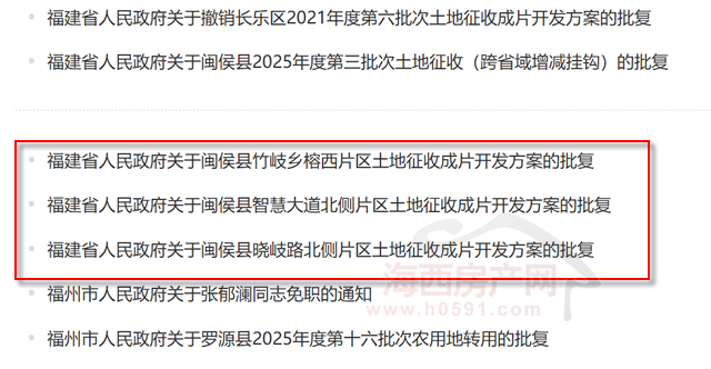 海西房产网(微信公众号:fjhxfcw)消息:11月12日,福建省人民政府批复“闽侯县智慧大道北侧片区、晓岐路北侧片区、竹岐乡榕西片区土地征收成片开发方案闽政地榕〔2025〕217号、218号、219号”。