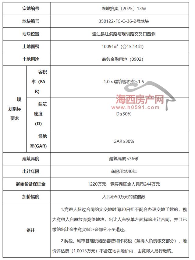 本次拍卖地块编号为连地拍卖〔2025〕13号,位于连江县江滨路与规划路交叉口西侧,土地用途为商务金融用地。