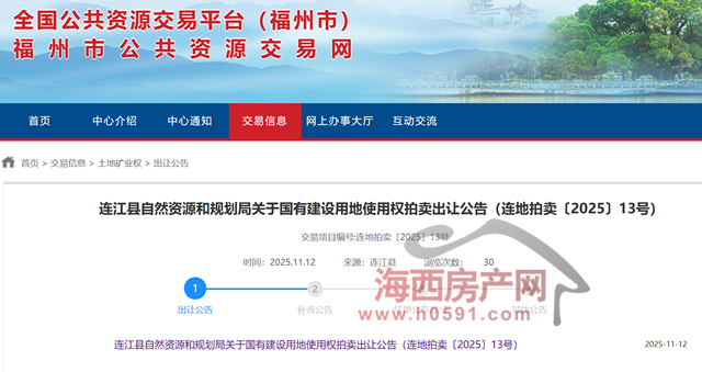 海西房产网(微信公众号:fjhxfcw)消息:11月12日,连江县自然资源和规划局发布“关于国有建设用地使用权拍卖出让公告(连地拍卖〔2025〕13号)”。
