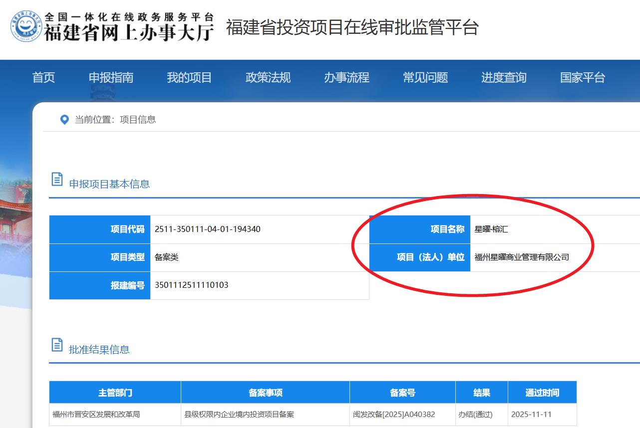 项目报建编号3501112511110103,项目(法人)单位为福州星曜商业管理有限公司,备案号闽发改备[2025]A040382 。主管部门为福州市晋安区发展和改革局。