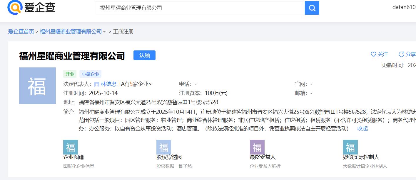 爱企查平台查询获悉,福州星曜商业管理有限公司成立于2025年10月14日,注册地位于福建省福州市晋安区福兴大道25号双兴数智园Ⅱ1号楼5层528,法定代表人为林德忠。