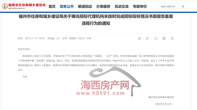 海西房产网(微信公众号:fjhxfcw)消息:11月12日,福州市住房和城乡建设局发布“关于曝光招标代理机构未按时完成招标投标情况书面报告备案违规行为的通知”。