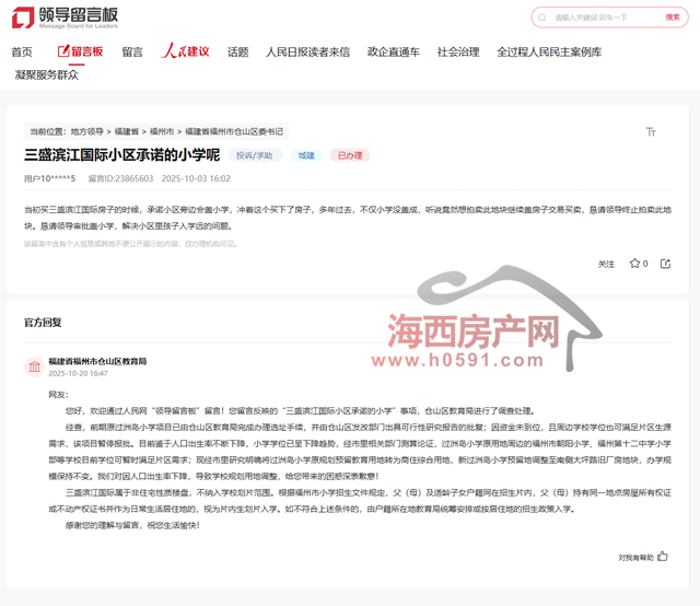 2025年10月20日得到福建省福州市仓山区教育局在回复市民相关咨询是表示,经查,前期原过洲岛小学项目已由仓山区教育局完成办理选址手续,并由仓山区发改部门出具可行性研究报告的批复;因资金未到位,且周边学校学位也可满足片区生源需求,该项目暂停报批。