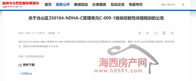 11月13日,福州市自然资源和规划局发布“关于仓山区350104-NDHA-C管理单元C-009-1地块控制性详细规划的公告”。