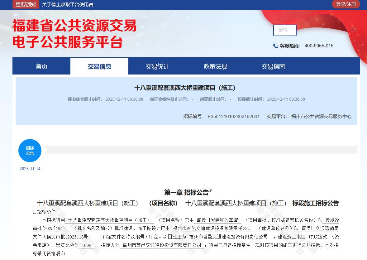 海西房产网(微信公众号:fjhxfcw)消息:2025年11月14日,福州市公共资源交易服务中心发布“十八重溪配套溪西大桥重建项目(施工)”。