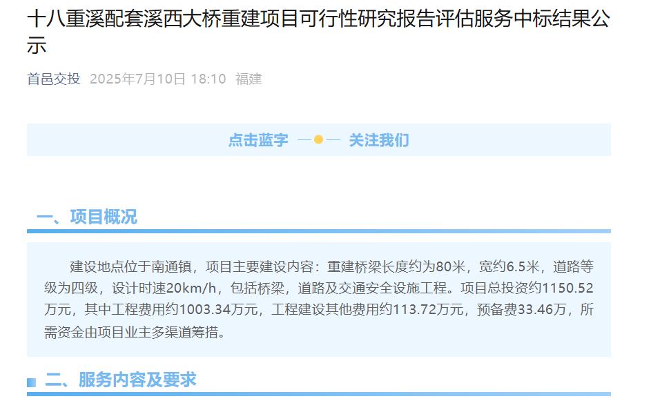 据首邑交投发布的“十八重溪配套溪西大桥重建项目可行性研究报告评估服务中标结果公示”,建设地点位于南通镇,项目主要建设内容:重建桥梁长度约为80米,宽约6.5米,道路等级为四级,设计时速20km/h,包括桥梁,道路及交通安全设施工程。