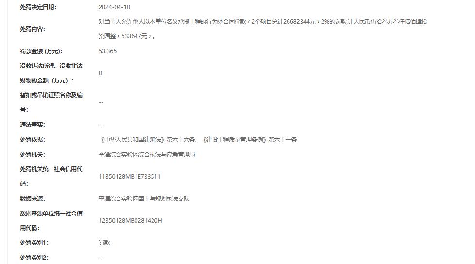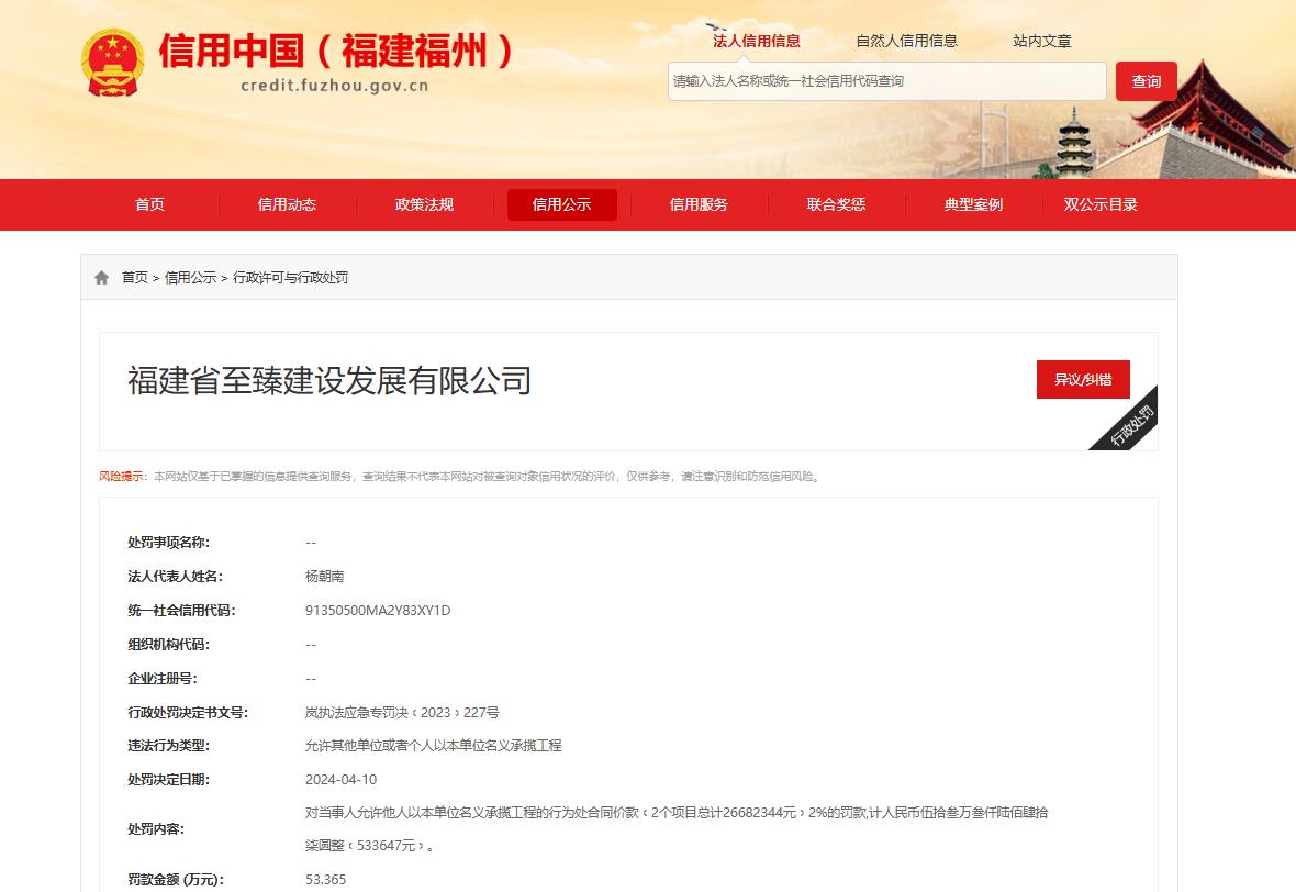 海西房产网(微信公众号:fjhxfcw)消息:近日,信用中国(福建福州)发布一则行政处罚,福建省至臻建设发展有限公司因对当事人允许他人以本单位名义承揽工程的行为,罚款金额53.365万元。