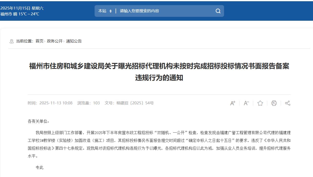 我局按照上级部门工作部署,开展2025年下半年房屋市政工程招投标“双随机、一公开”检查,检查发现由福建广誉工程管理有限公司代理的福建理工学校3#教学楼(实验楼)加固改造(施工)项目,其招标投标情况书面报告提交时间超过“确定中标人之日起十五日”的要求,违反了《中华人民共和国招标投标法》第四十七条规定。