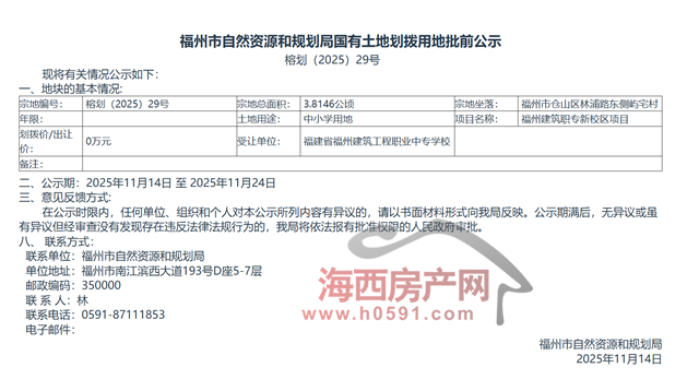 海西房产网(微信公众号:fjhxfcw)消息:11月14日,福州市自然资源和规划局发布一则国有土地划拨用地批前公示。