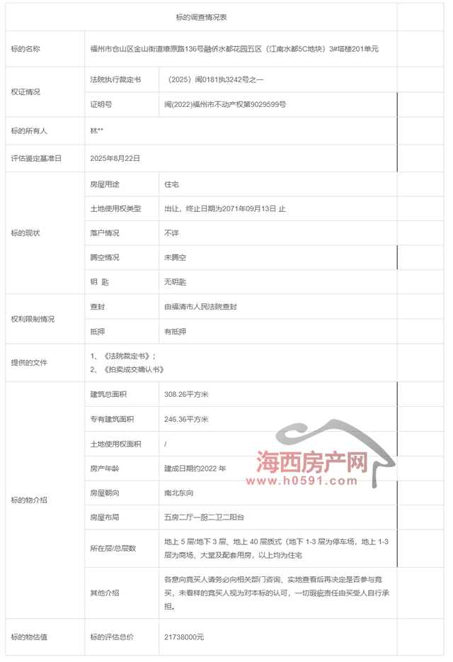 拍卖标的:福州市仓山区金山街道燎原路136号融侨水都花园五区(江南水都5C地块)【本网注:融侨外滩壹号】3#塔楼201单元【财产范围包括建筑物【含室内二次装修(墙面、地面、天棚装修装饰、不可移动的嵌入式家具家电以及其他拆卸将造成价格减损的装修装饰等),但不含可移动使用且移动后不影响其本身价格的电器、设备、家具等财产】及对应的土地使用权价值(含土地出让金),不包括债权债务、特许经营等其他财产或权益;建筑面积为308.26平方米(其中专有面积为246.36平方米),规划用途为住宅,土地使用权类型为出让】。