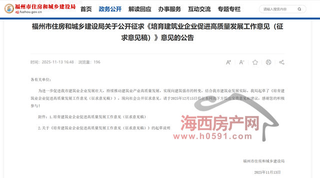 海西房产网(微信公众号:fjhxfcw)消息:11月13日,福州市住房和城乡建设局发布“关于公开征求《培育建筑业企业促进高质量发展工作意见(征求意见稿)》意见的公告”。