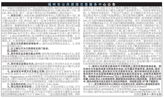 海西房产网(微信公众号:fjhxfcw)消息:11月17日,福州市公共资源交易服务中心发布一则公告。