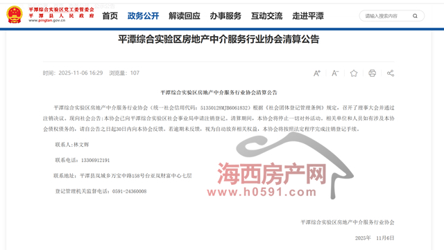 公告透露,平潭综合实验区房地产中介服务行业协会(统一社会信用代码:51350128MJB6061832)根据《社会团体登记管理条例》规定,召开了理事大会并通过注销决议。