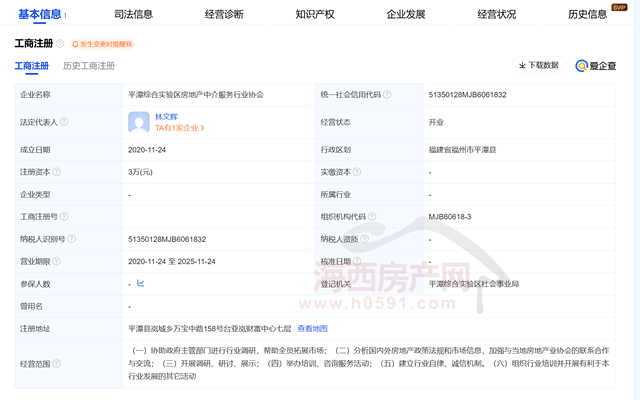爱企查资料显示,平潭综合实验区房地产中介服务行业协会成立于2020年11月24日,注册地位于平潭县岚城乡万宝中路158号台亚岚财富中心七层,法定代表人为林文辉。