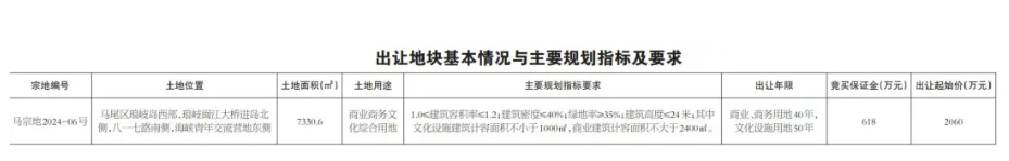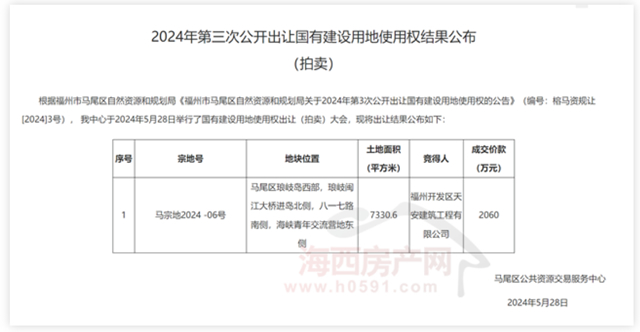 最终,福州开发区天安建筑工程有限公司以底价2060万元竞得马宗地2024 -06号,楼面价2341.78元/平方米。