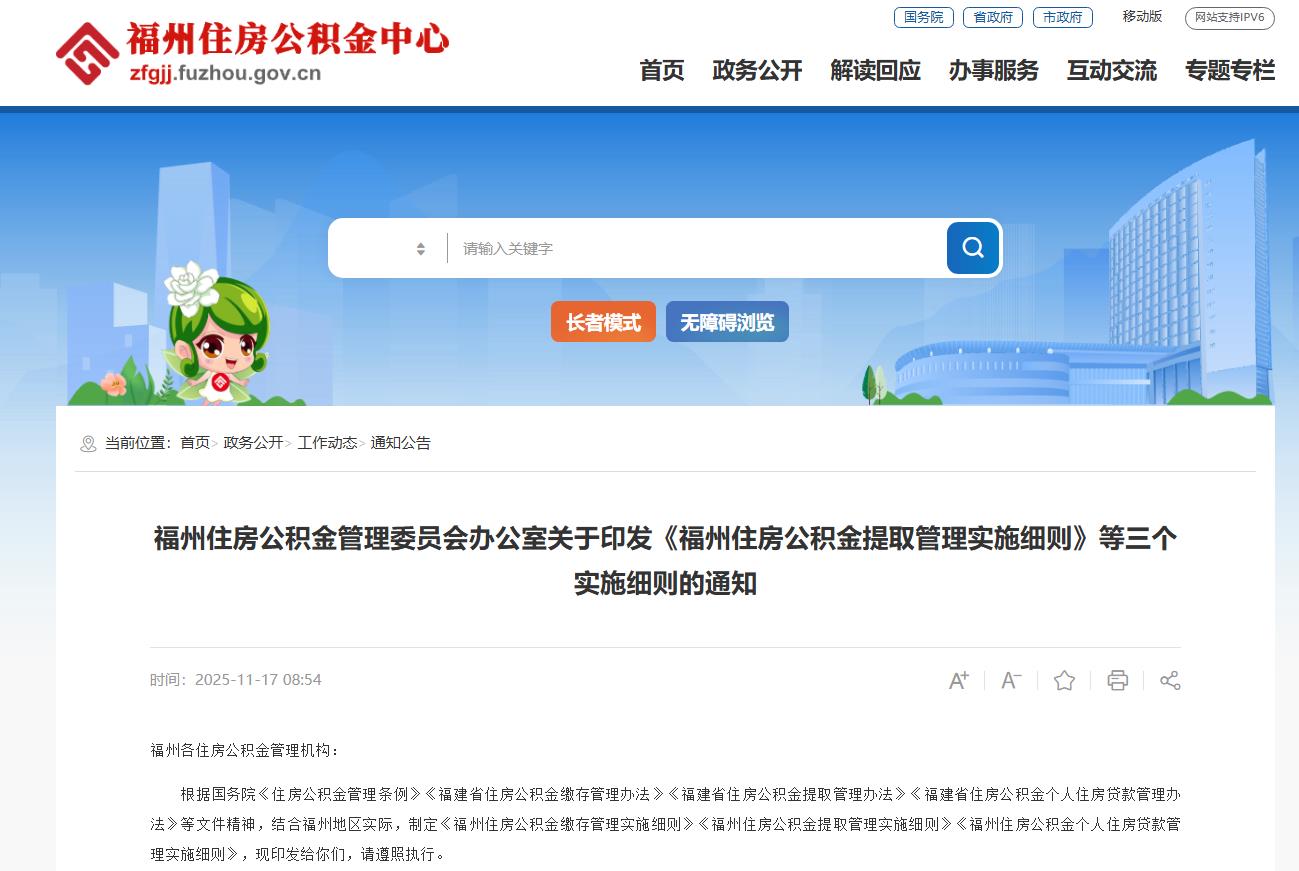 2025年11月 14 日,福州住房公积金管理委员会办公室发布“关于印发《福州住房公积金提取管理实施细则》等三个实施细则的通知”。