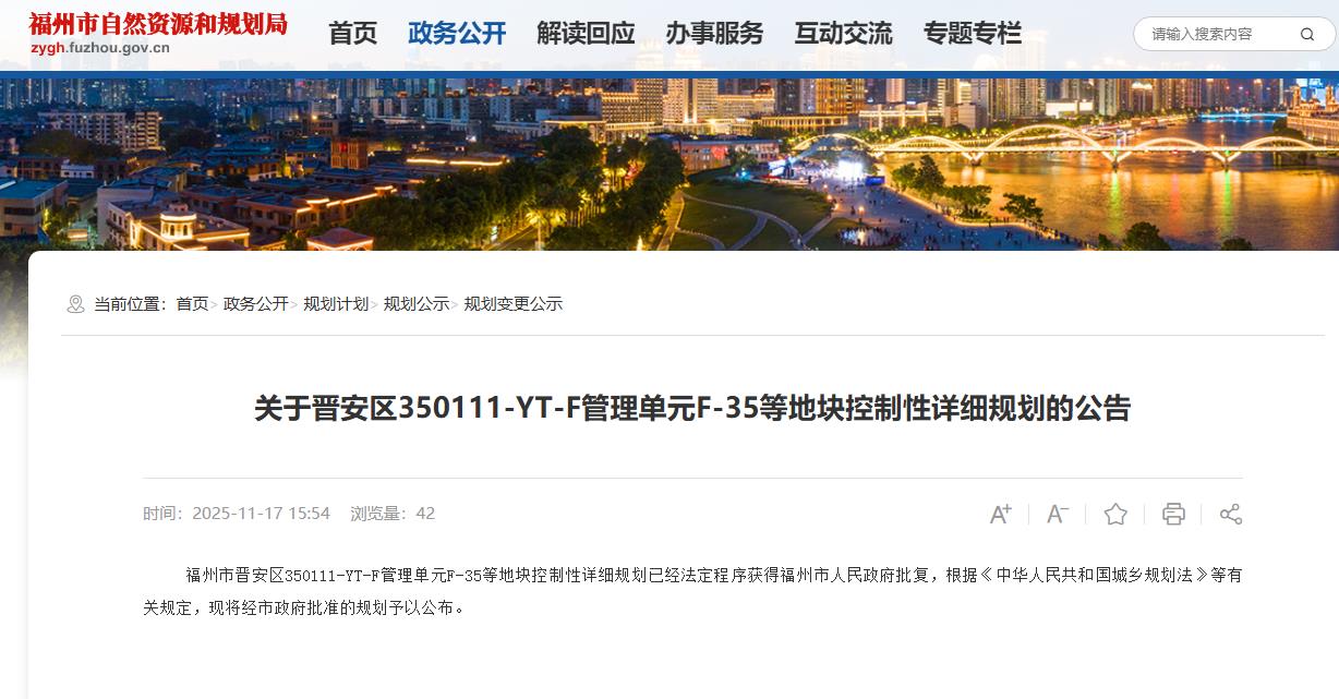 根据此前福州市自然资源和规划局发布“晋安区350111-YT-F管理单元F-35等地块控制性详细规划草案公示”。