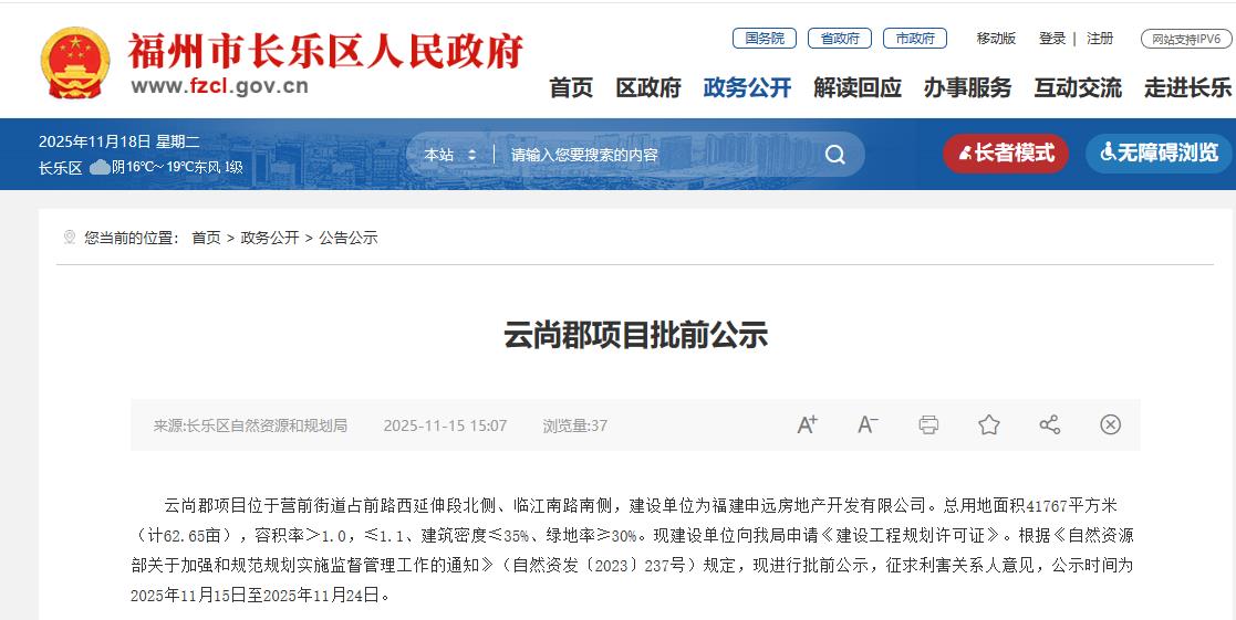 海西房产网(微信公众号:fjhxfcw)消息:2025年11月14日,福州市长乐区自然资源和规划局发布“云尚郡项目批前公示 ”。