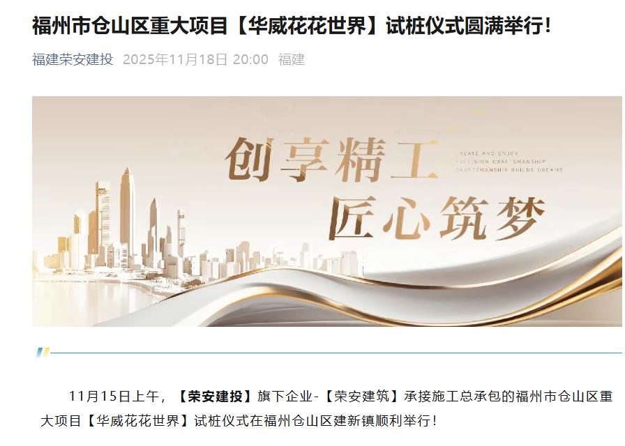 据福建荣安建设发文称,11月15日上午,【荣安建投】旗下企业-【荣安建筑】承接施工总承包的福州市仓山区重大项目【华威花花世界】试桩仪式在福州仓山区建新镇顺利举行!