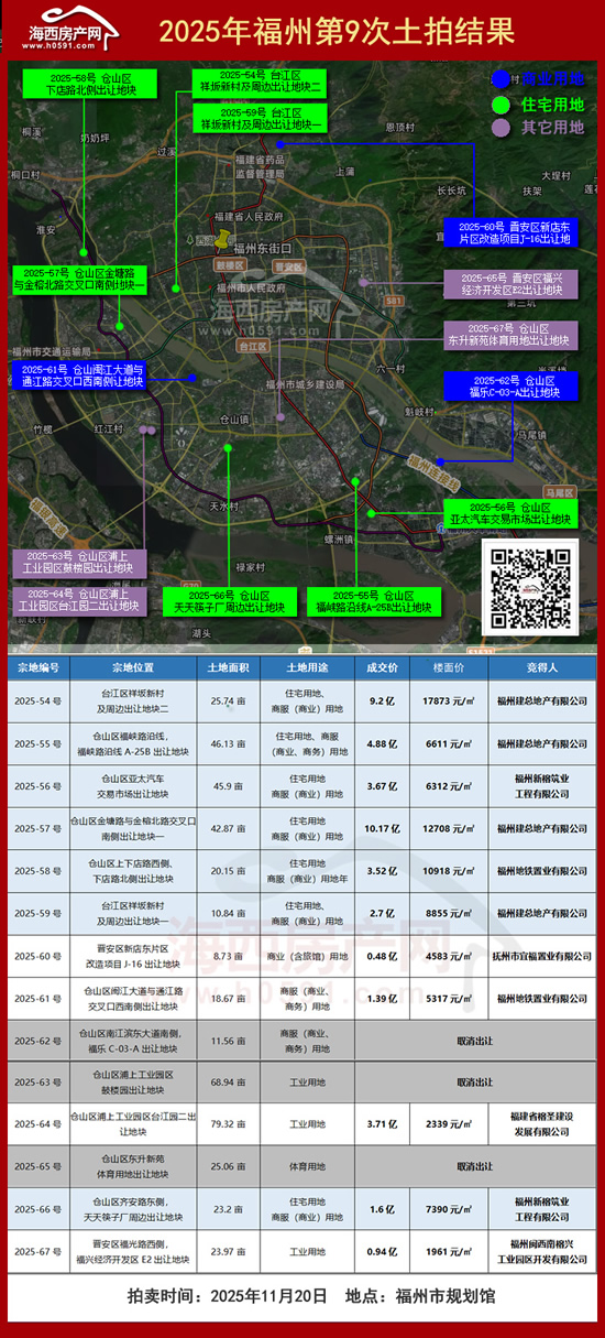 本次拍卖,共有9家房企报名参与。最终,经过两个半小时拍卖,除了福州宗地2025-65号取消出让以外,11幅地块全部拍出,总成交金额42.26亿!