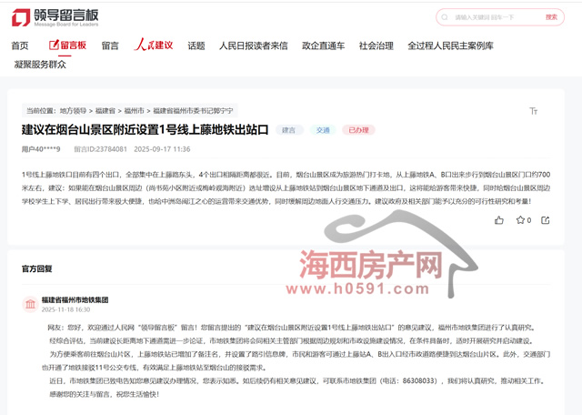 海西房产网(微信公众号:fjhxfcw)消息:近日,有市民通过人民网领导留言板提交建议:
