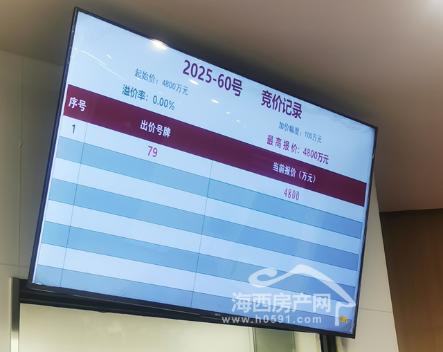 经过1轮竞价,79竞买人抚州市宜福置业有限公司以4800万竞得福州宗地2025-60号,楼面地价4583元/㎡。