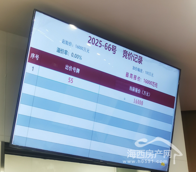 经过1轮竞价,55号竞买人福州新榕筑业工程有限公司以1.6亿竞得福州宗地2025-66号,楼面地价7390.43元/㎡。