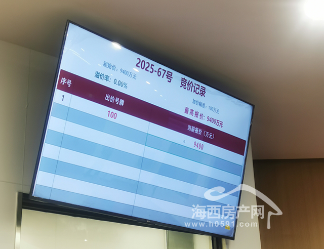 经过1轮竞价,100号竞买人福州闽西南榕兴工业园区开发有限公司以9400万竞得福州宗地2025-67号,楼面地价1,961.02元/㎡。