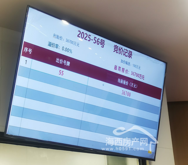 经过1轮竞价,55号竞买人福州新榕筑业工程有限公司以3.67亿竞得福州宗地2025-56号,楼面地价6312.14元/㎡。